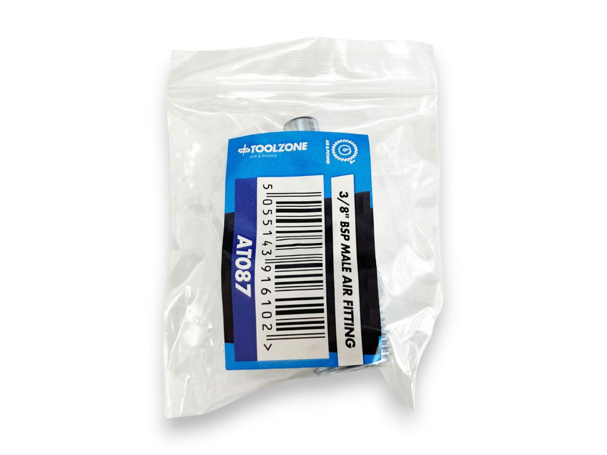 Package dimensions: 2x2x6cm. 3/8” bsp male fitting. Zinc plated steel. Suitable for pcl fittings. Packaged in plastic bag with barcode sticker.